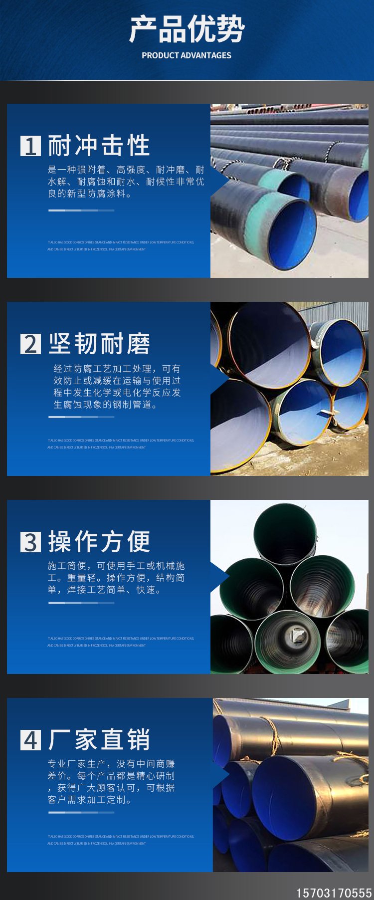由于是非極性分子與鋼管附著力的持久性差;環(huán)氧樹脂屬于極性分子,有羥基基團在一定溫度下,易與鋼管發(fā)生反應,附著力極強,但是由于是熱固性物質(zhì),不耐磕碰。因此兩種材料的組合屬于目前防腐行業(yè)最佳搭配。涂塑鋼管行業(yè)由最早是內(nèi)外聚乙烯,由于聚乙烯與鋼管基體附著力不好,后來發(fā)展到內(nèi)外環(huán)氧,但是外環(huán)氧層不耐磕碰,后來發(fā)展到第三代內(nèi)環(huán)氧外聚乙烯,但是單層聚乙烯直接與鋼管結(jié)合還是存在附著力問題,最后升級到現(xiàn)在的第四代防腐內(nèi)熱熔環(huán)氧外三層結(jié)構聚乙烯,簡稱TPEP防腐鋼管。