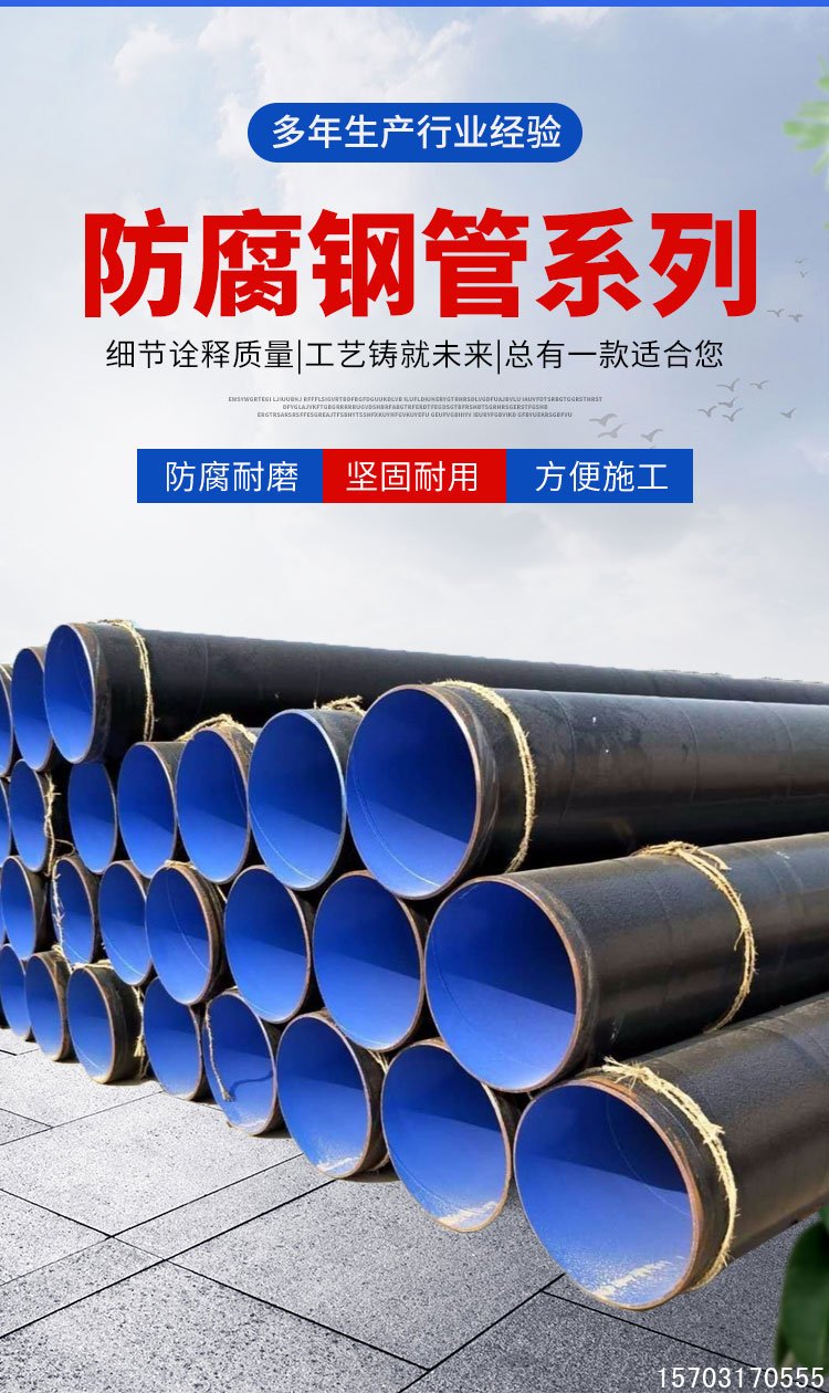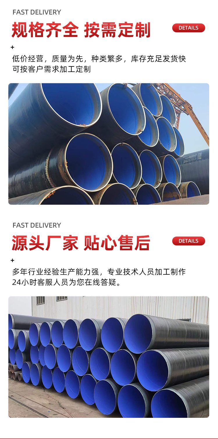 外壁采用熱熔結(jié)纏繞工藝底層環(huán)氧樹脂、中間層膠黏劑、外層聚乙烯形成三層結(jié)構的防腐層,內(nèi)壁采用熱噴涂環(huán)氧粉末防腐方式,將粉末經(jīng)高溫加熱熔結(jié)后均勻地涂敷在管體表面上,形成鋼塑復合層,極大提高了涂層附著力及涂層厚度,增強了耐磕碰,耐腐蝕的能力。
